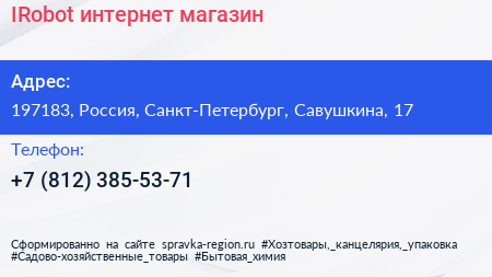IRobot, интернет-магазин по адресу 197183, Россия, Санкт-Петербург, Савушкина, 17 в дальнейшем Организация, размещена в следующих категориях: