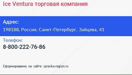 Ice Ventura, торговая компания по адресу 198188, Россия, Санкт-Петербург, Зайцева, 41 в дальнейшем Организация, размещена в следующих категориях: