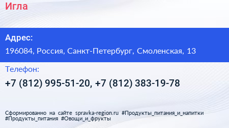 Игла по адресу 196084, Россия, Санкт-Петербург, Смоленская, 13 в дальнейшем Организация, размещена в следующих категориях: