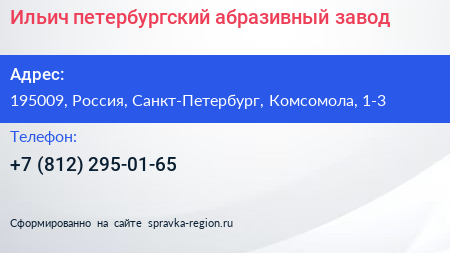 Ильич, петербургский абразивный завод по адресу 195009, Россия, Санкт-Петербург, Комсомола, 1-3 в дальнейшем Организация, размещена в следующих категориях: