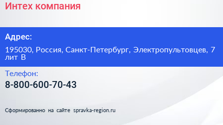 Интех, компания по адресу 195030, Россия, Санкт-Петербург, Электропультовцев, 7 лит В в дальнейшем Организация, размещена в следующих категориях: