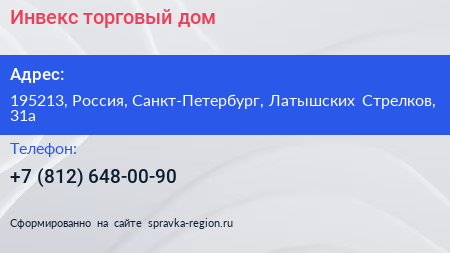 Инвекс, торговый дом по адресу 195213, Россия, Санкт-Петербург, Латышских Стрелков, 31а в дальнейшем Организация, размещена в следующих категориях: