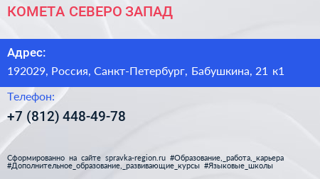 КОМЕТА СЕВЕРО-ЗАПАД по адресу 192029, Россия, Санкт-Петербург, Бабушкина, 21 к1 в дальнейшем Организация, размещена в следующих категориях: