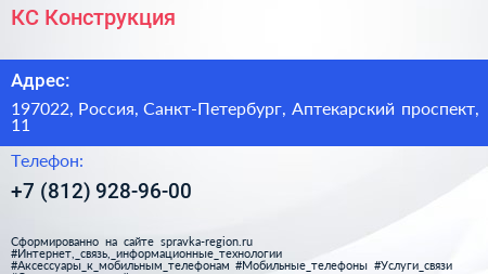 КС-Конструкция по адресу 197022, Россия, Санкт-Петербург, Аптекарский проспект, 11 в дальнейшем Организация, размещена в следующих категориях: