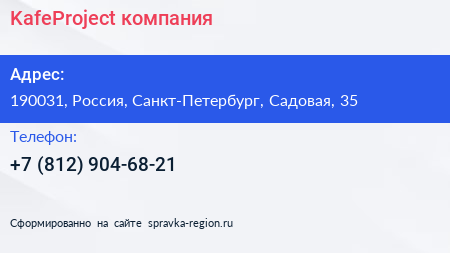 KafeProject, компания по адресу 190031, Россия, Санкт-Петербург, Садовая, 35 в дальнейшем Организация, размещена в следующих категориях: