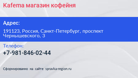 Kafema, магазин-кофейня по адресу 191123, Россия, Санкт-Петербург, проспект Чернышевского, 3 в дальнейшем Организация, размещена в следующих категориях: