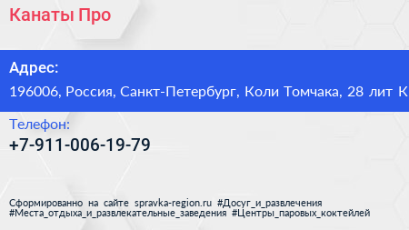 Канаты Про по адресу 196006, Россия, Санкт-Петербург, Коли Томчака, 28 лит К в дальнейшем Организация, размещена в следующих категориях: