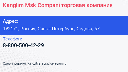 Kanglim Msk Compani, торговая компания по адресу 192171, Россия, Санкт-Петербург, Седова, 57 в дальнейшем Организация, размещена в следующих категориях:
