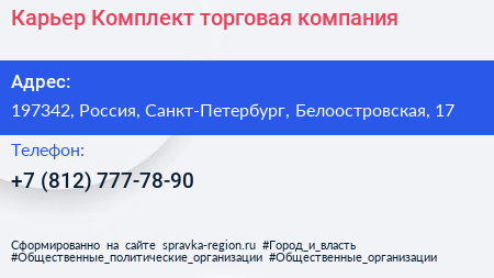 Карьер Комплект, торговая компания по адресу 197342, Россия, Санкт-Петербург, Белоостровская, 17 в дальнейшем Организация, размещена в следующих категориях: