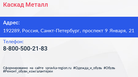 Каскад-Металл по адресу 192289, Россия, Санкт-Петербург, проспект 9 Января, 21 в дальнейшем Организация, размещена в следующих категориях:
