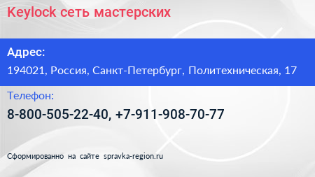 Keylock, сеть мастерских по адресу 194021, Россия, Санкт-Петербург, Политехническая, 17 в дальнейшем Организация, размещена в следующих категориях: