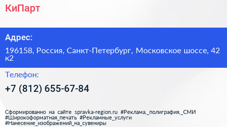 КиПарт по адресу 196158, Россия, Санкт-Петербург, Московское шоссе, 42 к2 в дальнейшем Организация, размещена в следующих категориях: