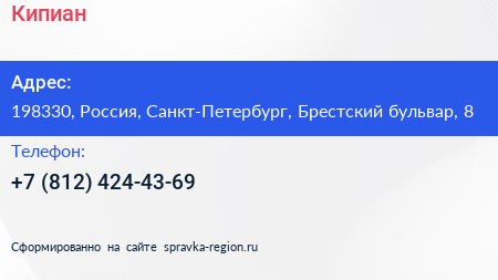 Кипиан по адресу 198330, Россия, Санкт-Петербург, Брестский бульвар, 8 в дальнейшем Организация, размещена в следующих категориях: