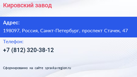 Кировский завод по адресу 198097, Россия, Санкт-Петербург, проспект Стачек, 47 в дальнейшем Организация, размещена в следующих категориях: