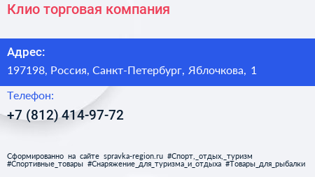 Клио, торговая компания по адресу 197198, Россия, Санкт-Петербург, Яблочкова, 1 в дальнейшем Организация, размещена в следующих категориях: