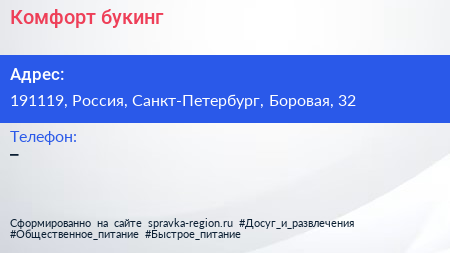 Комфорт букинг по адресу 191119, Россия, Санкт-Петербург, Боровая, 32 в дальнейшем Организация, размещена в следующих категориях: