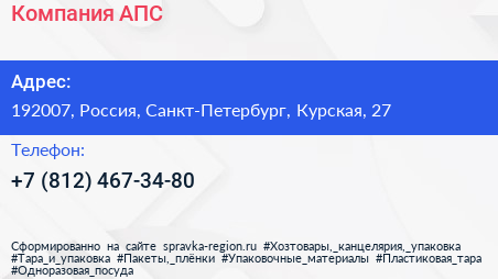 Компания АПС по адресу 192007, Россия, Санкт-Петербург, Курская, 27 в дальнейшем Организация, размещена в следующих категориях: