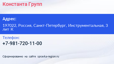 Константа Групп по адресу 197022, Россия, Санкт-Петербург, Инструментальная, 3 лит К в дальнейшем Организация, размещена в следующих категориях: