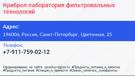 Криброл, лаборатория фильтровальных технологий по адресу 196006, Россия, Санкт-Петербург, Цветочная, 25 в дальнейшем Организация, размещена в следующих категориях: