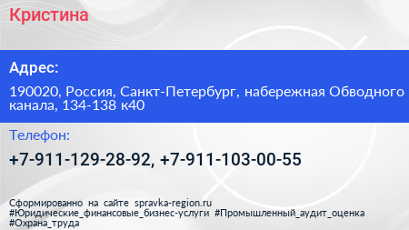 Кристина по адресу 190020, Россия, Санкт-Петербург, набережная Обводного канала, 134-138 к40 в дальнейшем Организация, размещена в следующих категориях: