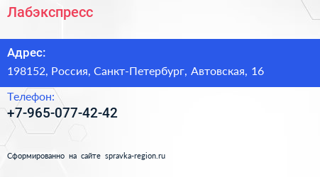 Лабэкспресс по адресу 198152, Россия, Санкт-Петербург, Автовская, 16 в дальнейшем Организация, размещена в следующих категориях: