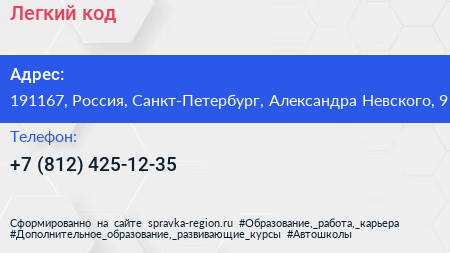 Легкий код по адресу 191167, Россия, Санкт-Петербург, Александра Невского, 9 в дальнейшем Организация, размещена в следующих категориях: