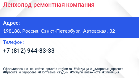 Ленхолод, ремонтная компания по адресу 198188, Россия, Санкт-Петербург, Автовская, 32 в дальнейшем Организация, размещена в следующих категориях: