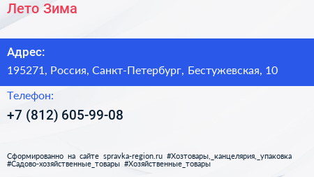 Лето Зима по адресу 195271, Россия, Санкт-Петербург, Бестужевская, 10 в дальнейшем Организация, размещена в следующих категориях: