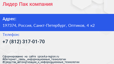 Лидер-Пак, компания по адресу 197374, Россия, Санкт-Петербург, Оптиков, 4 к2 в дальнейшем Организация, размещена в следующих категориях: