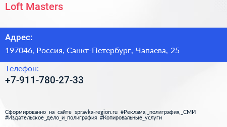 Loft Masters по адресу 197046, Россия, Санкт-Петербург, Чапаева, 25 в дальнейшем Организация, размещена в следующих категориях:
