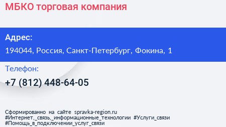 МБКО, торговая компания по адресу 194044, Россия, Санкт-Петербург, Фокина, 1 в дальнейшем Организация, размещена в следующих категориях: