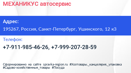 МЕХАНИКУС, автосервис по адресу 195267, Россия, Санкт-Петербург, Ушинского, 12 к3 в дальнейшем Организация, размещена в следующих категориях: