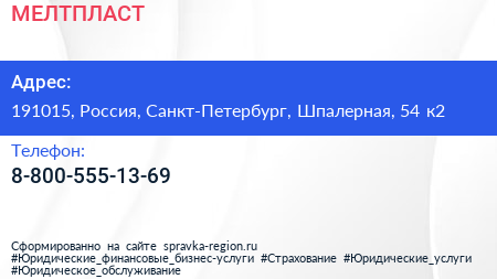 МЕЛТПЛАСТ по адресу 191015, Россия, Санкт-Петербург, Шпалерная, 54 к2 в дальнейшем Организация, размещена в следующих категориях: