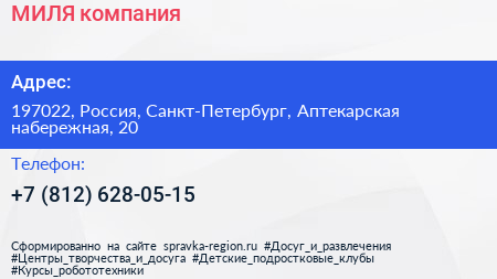МИЛЯ, компания по адресу 197022, Россия, Санкт-Петербург, Аптекарская набережная, 20 в дальнейшем Организация, размещена в следующих категориях: