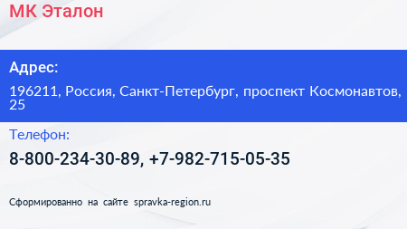 МК-Эталон по адресу 196211, Россия, Санкт-Петербург, проспект Космонавтов, 25 в дальнейшем Организация, размещена в следующих категориях: