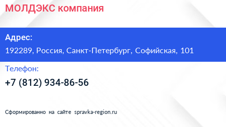 МОЛДЭКС, компания по адресу 192289, Россия, Санкт-Петербург, Софийская, 101 в дальнейшем Организация, размещена в следующих категориях:
