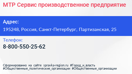 МТР-Сервис, производственное предприятие по адресу 195248, Россия, Санкт-Петербург, Партизанская, 25 в дальнейшем Организация, размещена в следующих категориях: