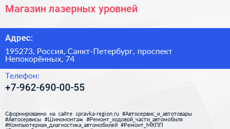 Магазин лазерных уровней по адресу 195273, Россия, Санкт-Петербург, проспект Непокорённых, 74 в дальнейшем Организация, размещена в следующих категориях: