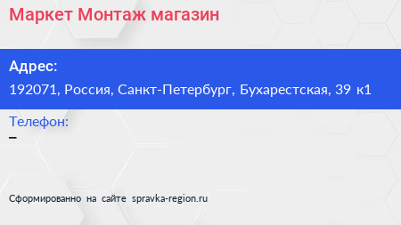 Маркет Монтаж, магазин по адресу 192071, Россия, Санкт-Петербург, Бухарестская, 39 к1 в дальнейшем Организация, размещена в следующих категориях: