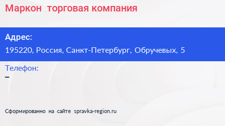 Маркон+, торговая компания по адресу 195220, Россия, Санкт-Петербург, Обручевых, 5 в дальнейшем Организация, размещена в следующих категориях: