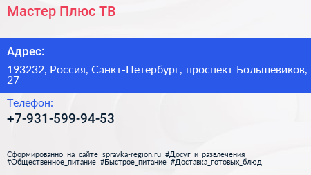 Мастер Плюс ТВ по адресу 193232, Россия, Санкт-Петербург, проспект Большевиков, 27 в дальнейшем Организация, размещена в следующих категориях: