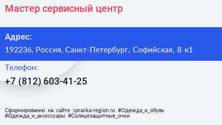 Мастер, сервисный центр по адресу 192236, Россия, Санкт-Петербург, Софийская, 8 к1 в дальнейшем Организация, размещена в следующих категориях: