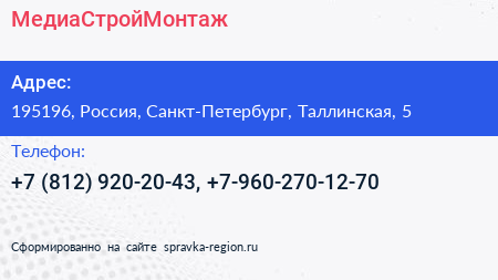 МедиаСтройМонтаж по адресу 195196, Россия, Санкт-Петербург, Таллинская, 5 в дальнейшем Организация, размещена в следующих категориях: