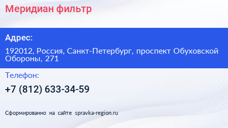 Меридиан-фильтр по адресу 192012, Россия, Санкт-Петербург, проспект Обуховской Обороны, 271 в дальнейшем Организация, размещена в следующих категориях: