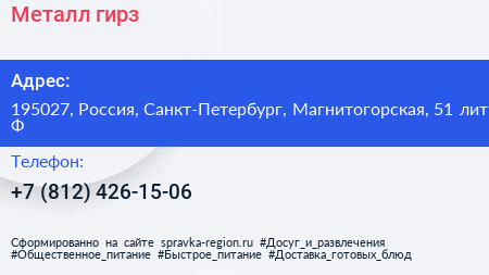Металл гирз по адресу 195027, Россия, Санкт-Петербург, Магнитогорская, 51 лит Ф в дальнейшем Организация, размещена в следующих категориях: