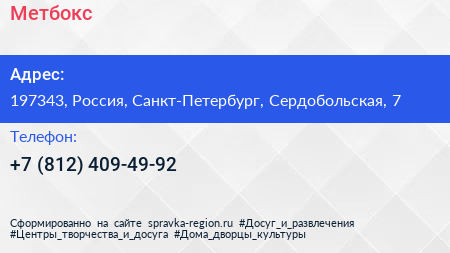 Метбокс по адресу 197343, Россия, Санкт-Петербург, Сердобольская, 7 в дальнейшем Организация, размещена в следующих категориях: