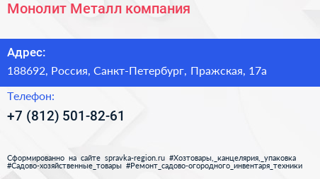 Монолит Металл, компания по адресу 188692, Россия, Санкт-Петербург, Пражская, 17а в дальнейшем Организация, размещена в следующих категориях: