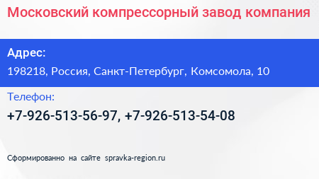 Московский компрессорный завод, компания по адресу 198218, Россия, Санкт-Петербург, Комсомола, 10 в дальнейшем Организация, размещена в следующих категориях: