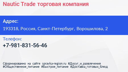 Nautic Trade, торговая компания по адресу 193318, Россия, Санкт-Петербург, Ворошилова, 2 в дальнейшем Организация, размещена в следующих категориях: