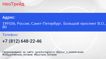 НеоТрейд по адресу 199106, Россия, Санкт-Петербург, Большой проспект В.О., 80 в дальнейшем Организация, размещена в следующих категориях: